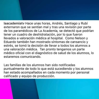 A través de un comunicado, La Academia informó que Santiago, Nelson, Eduardo y Andrés se encuentran negativos de Covid-19, pero con un cuadro de deshidratación, el cual ya fue estabilizado. Se detalló que todos ellos durmieron en el hospital y esperan ser dados de alta esta tarde y regresar a la casa de "La Academia". Santiago y Andrés se encuentran acompañados de sus familiares.
