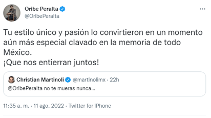 El famoso narrador de TV Azteca escribió en su cuenta de Twitter "Oribe Peralta no te mueras nunca" y de inmediato recibió respuesta del histórico goleador.