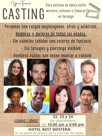 El casting se llevará a cabo los días 22, 23 y 24 de septiembre, de 10:00 de la mañana a 06:00 de la tarde, en el hotel Best Western, ubicado en Gines Vázquez de Mercado 806, colonia Nueva Vizcaya, en la capital duranguense.