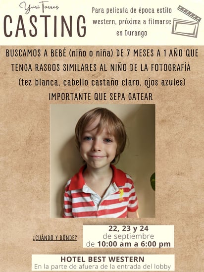 También se estará realizando un casting para menores, en el que se buscará a un niño o niña de entre siete meses y un año de edad, que sea de tez blanca, cabello castaño claro y ojos azules, similar a una fotografía que compartieron; señalan que es importante que el o la bebé, sepa gatear.