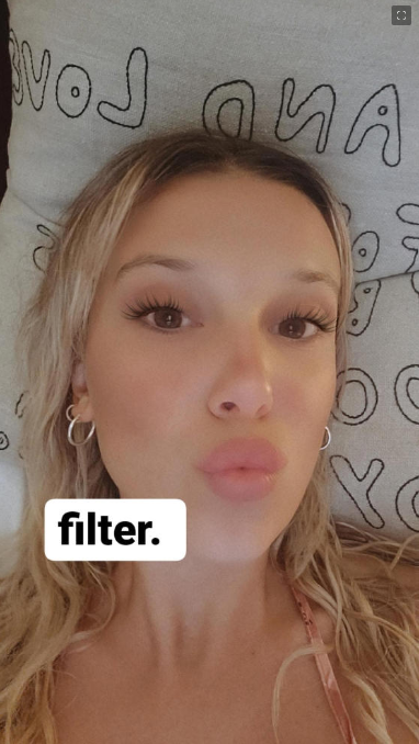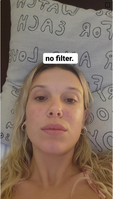Recientemente, Millie Bobby Brown decidió compartir unas fotografías en sus historias de Instagram donde muestra como un filtro puede cambiar todas nuestras facciones. En una primera foto la protagonista de Enola Holmes se muestra con su rostro lleno de filtros, mientras que en una segunda fotografía devela su rostro al natural.