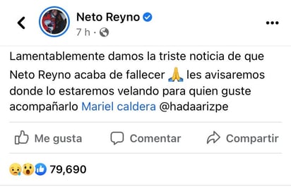 "Lamentablemente, damos la triste noticia de que Neto Reyno acaba de fallecer", escribió la mujer, quien además compartió que se dará a conocer el lugar en el que se llevarán los servicios funerarios para que sus fans, y toda la gente que así lo quiera, pueda darle el último adiós.