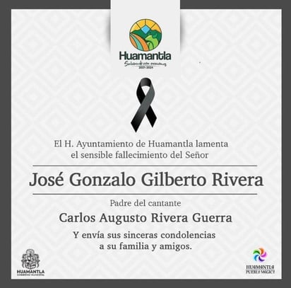 El cantante Carlos Rivera está de luto. El Ayuntamiento de Huamantla, Tlaxcala, informó alrededor de las 21:00 horas, mediante redes sociales, acerca de la muerte del papá del cantante, José Gonzalo Gilberto Rivera. El Ayuntamiento manifestó sus condolencias a la familia y conocidos.