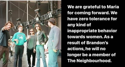 Las palabras de la intérprete de "Otro atardecer", canción en la que colaboró con Ban Bunny, llegaron hasta oídos de The Neighbourhood quienes decidieron expulsar al músico por su comportamiento inapropiado: "Tenemos cero tolerancia por cualquier tipo de comportamiento inapropiado hacia las mujeres", explicaron en sus redes. "Como resultado de las acciones de Brandon, ya no será más miembro de The Neighbourhood".