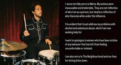 Por su parte, el exbaterista de The Neighbourhood también se pronunció a las acusaciones hechas en su contra y aunque no negó los hechos, sí se disculpó por lo sucedido, ya que aseguró se encontraba en estado inconveniente: