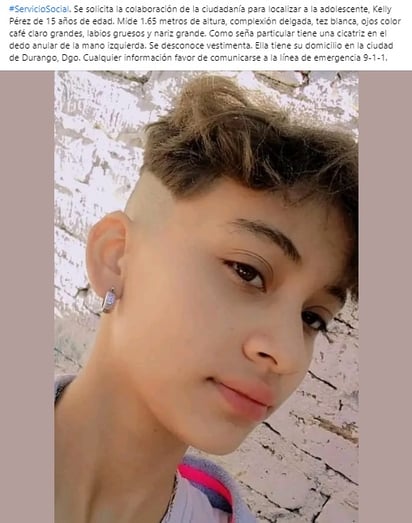 A través de redes sociales, familiares y amigos de Kelly Pérez, de 15 años de edad, piden ayuda de la ciudadanía para poder encontrar a la adolescente, quien lleva varias horas desaparecida en la ciudad de Durango y se teme por su integridad.