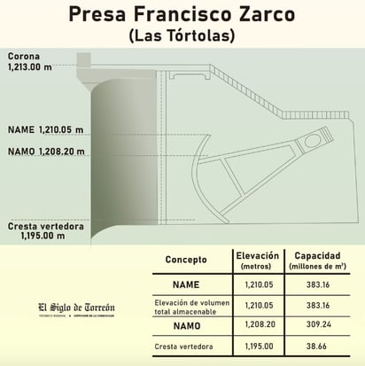 Es decir, la presa Zarco tiene un NAME de 383 Mm3 y un NAMO de 309. A partir de esta última cifra se determina que el vaso se encuentra al 99 por ciento de su capacidad, a 308 Mm3, pero es un porcentaje mucho menor si se toma como referencia el NAME.