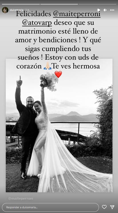 "¡Felicidades, Maite Perroni y Andrés Tovar, deseo que su matrimonio esté lleno de amor y bendiciones! ¡Y que sigas cumpliendo tus sueños! Estoy con ustedes de corazón, ¡Te ves hermosa!".