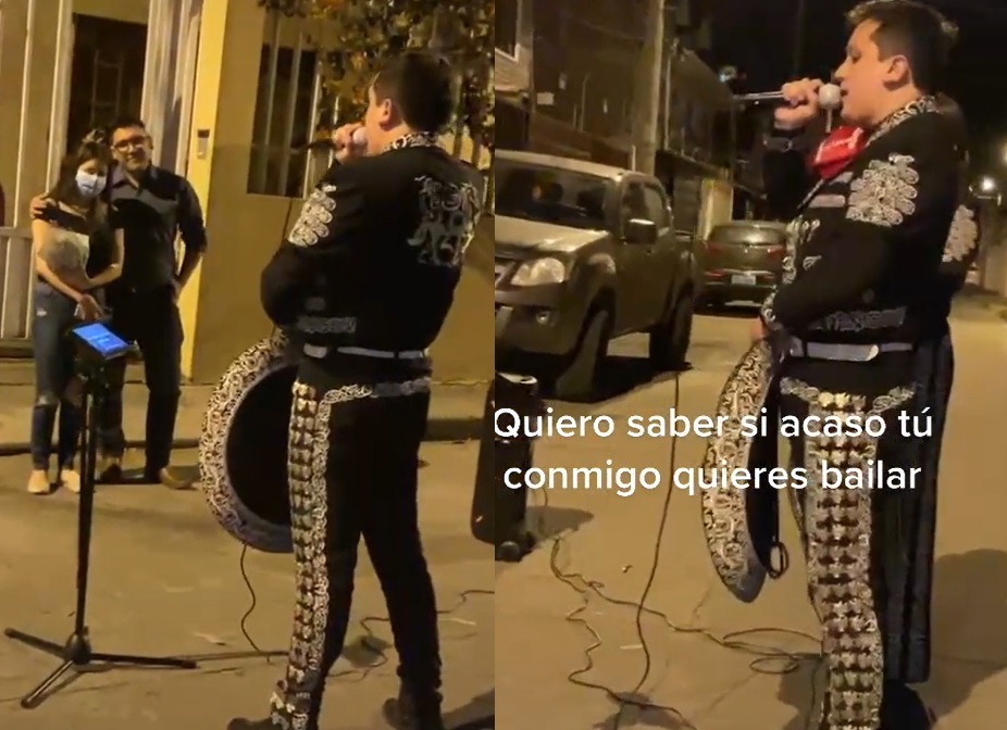 El usuario de TikTok @bryamcabrera publicó un video donde se observa a la pareja a la entrada de una vivienda, mientras disfrutan del concierto bajo la luz de un farol y de la luna. La joven sostiene un ramo de flores bajo el brazo, y los mariachis cantan emocionados el tema de la serie animada japonesa.