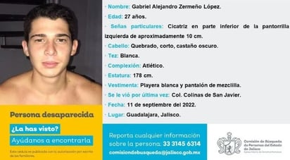 El joven mide 1.78 metros de estatura, es de tez clara y vestía una playera blanca con pantalón de mezclilla la última vez que fue visto, en la colonia Colinas de San Javier en Guadalajara.