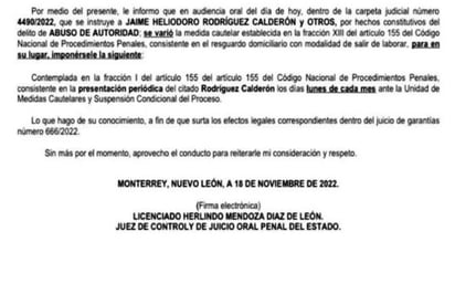 El exgobernador de Nuevo León, Jaime Rodríguez Calderón "Bronco", podrá dejar su arraigo domiciliario por el caso de la Ecovía, así lo determinó un juez de control de dicho estado. Como requisito para esto, el exmandatario tendrá que asistir a un juzgado cada lunes para firmar.