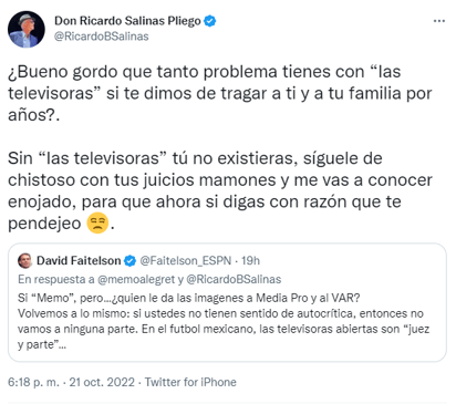 Todo comenzó cuando Faitelson comentó que "en el futbol mexicano, las televisoras abiertas son 'juez y parte'…" al responderle a Guillermo Alegret, director general de Ventas y Marketing de la Liga Mx, quien también arrobó a Salinas Pliego.