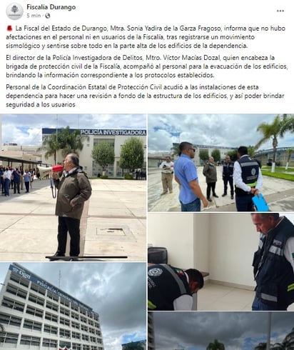 La Fiscalía General de Durango reportó, luego de registrar el movimiento sismológico, que tanto el personal como los usuarios que se encontraban en las inslataciones fueron evacuados de los edificios, por lo que no se reportan afectaciones.