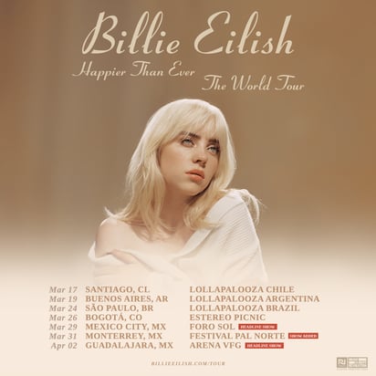 A través de las redes sociales de la cantante estadounidense se dieron a conocer las fechas en las que regresará a México con su Happier Than Ever The World Tour, que sirve de promoción para su segundo álbum de estudio Happier Than Ever.