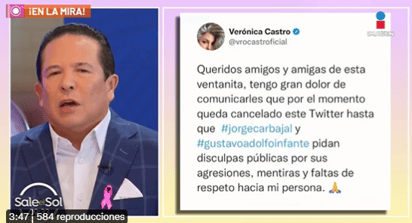 Durante el programa "Sale el Sol", Gustavo Adolfo Infante se tomó unos minutos para responder al mensaje de la actriz Verónica Castro, en el que aseguraba que dejaría Twitter hasta que el conductor y el youtuber, Jorge Carbajal, le ofrecieran disculpas por los señalamientos que hicieron en su contra.