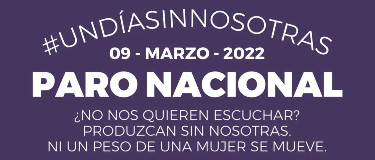 Como protesta ante la ola de violencia de género y feminicidios en México, colectivos feministas hacen un llamado a todas las mujeres para continuar con el paro nacional "Un día sin nosotras 2022" cuyo objetivo es hacer conciencia sobre la violencia de género, además, de señalar la importancia de las actividades que realizan las mujeres en la sociedad. Este día se lleva a cabo un día después del Día Internacional de la Mujer, es decir 9 de marzo.