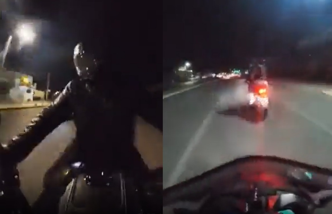 El video fue captado por una cámara instalada en la motocicleta y muestra cómo, mientras circula por la carretera de noche, dos sujetos a bordo de otra moto se le acercan, le gritan palabras altisonantes para que se detenga y le apuntan con el arma para intimidarlo; sin embargo, el motociclista acelera y logra dejarlos atrás.