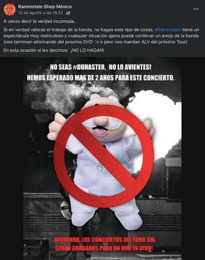 “Rammstein tiene un espectáculo muy meticuloso y cualquier situación ajena puede conllevar un enojo de la banda (nos terminen eliminando del próximo DVD o peor nos mandan ALV del próximo Tour) En esta ocasión si les decimos: ¡NO LO HAGAN!”
