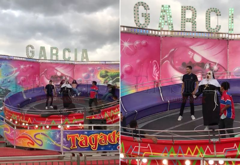 Durante el primer día de la Feria de Durango, los asistentes pudieron presenciar una peculiar escena en la zona de juegos mecánicos, pues una “monja” se encontraba en una de las atracciones, animando a los duranguenses.