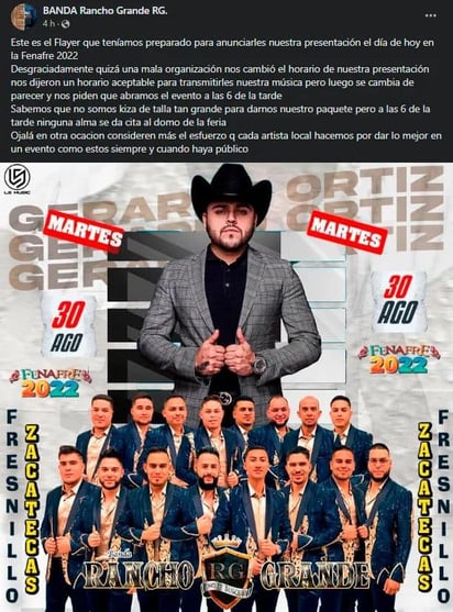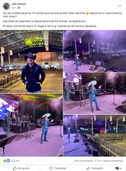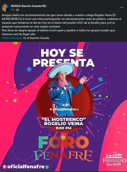 "Más tarde se presentará La Descendencia de Río Grande, los esperamos! En estos momentos está el Sr. Rogelio Veina (El Monstreco) de Morelos, Zacatecas", concluye su publicación.