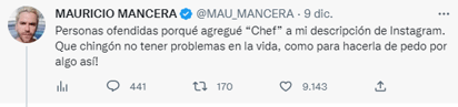 Ante esta ola de críticas y ataques, Mau se pronunció al respecto en su cuenta de Twitter y escribió: "Personas ofendidas porqué agregué “Chef” a mi descripción de Instagram. Que chingón no tener problemas en la vida, como para hacerla de pedo por algo así!"