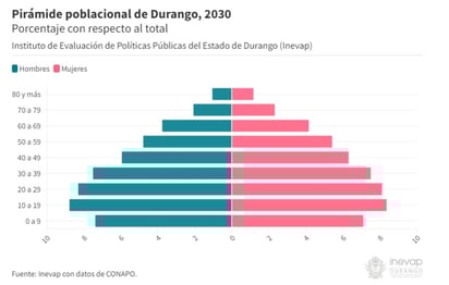 Hacia adelante, se espera que la población de Durango alcance dos millones de habitantes en 2030 y 2.2 millones en 2050. En ese año, la estructura piramidal acumulará una mayor proporción de personas en edades adultas avanzadas. A pesar de que no son el único grupo poblacional que conforma el universo de población dependiente, su crecimiento esperado para los próximos años (con respecto a la población total) dará lugar al aumento de la demanda de cuidados, por lo tanto, será necesario mejorar las condiciones de las personas que los proveen, principalmente las mujeres.