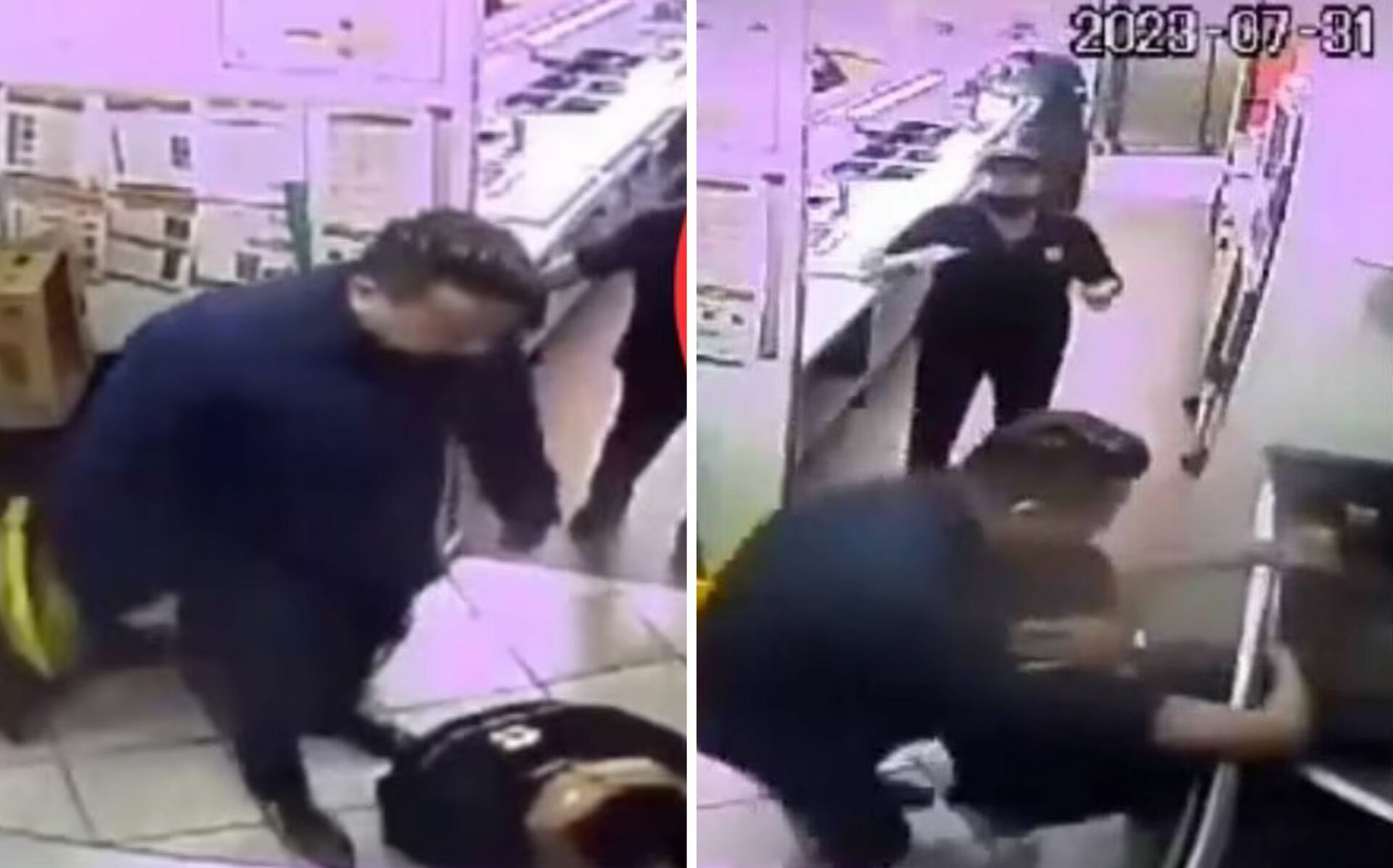 En el video, captado por una de las cámaras de seguridad del establecimiento, se ve al joven sometido y desvanecido sobre el fregadero, mientras un hombre de camiseta azul le da golpes en la cabeza, para después lanzar una patada en las piernas y al ver que este no cae, lo toma del cuello y lo tira al piso, golpeándolo de nuevo en la cabeza.