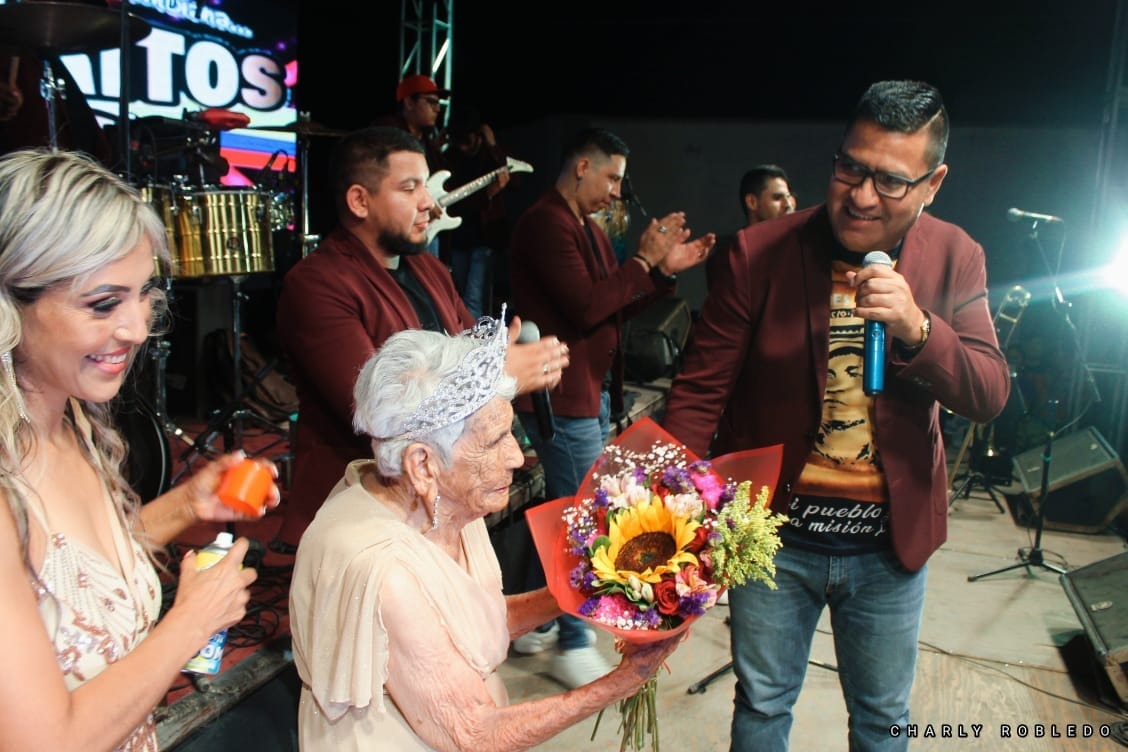 Ricardo "Rishie" Luna invitó a Doña Agripina al escenario para darle unas flores, además de que la felicitó por su siglo de vida.