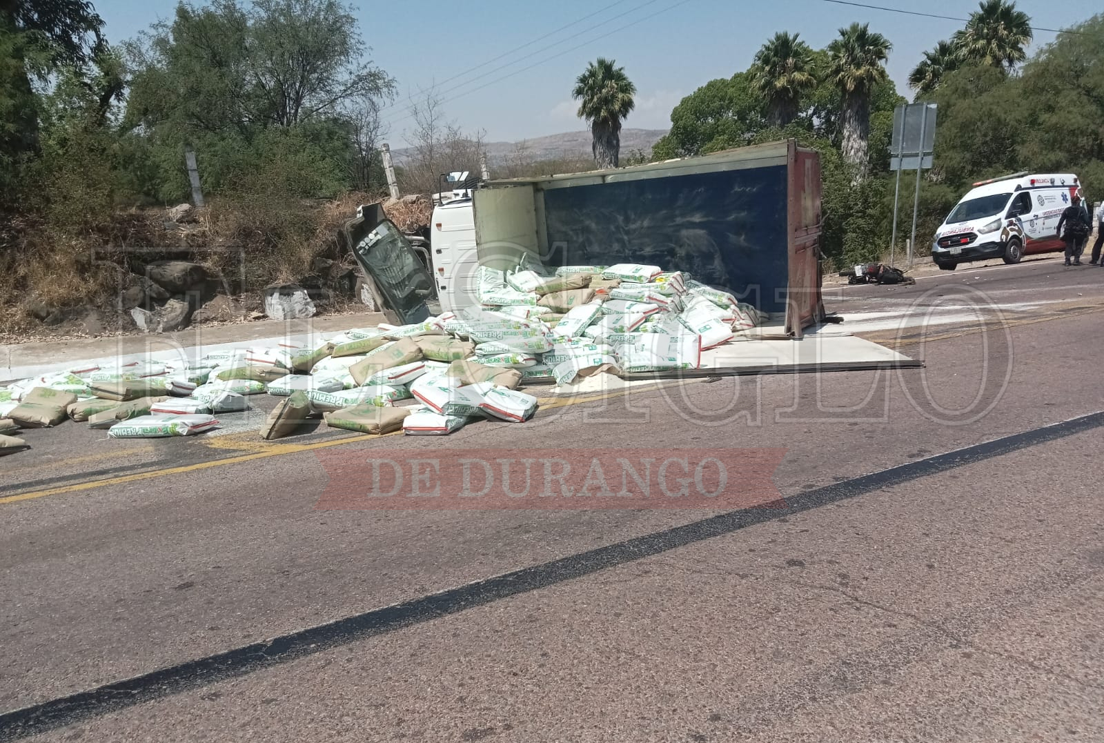 Un tráiler cargado con bultos de maseca transitaba por la carretera que conduce a Nombre de Dios, cuando perdió el control y volcó sobre uno de sus costados, provocando que un camión de pasajeros tratara de detener su marcha y se impactara contra una motocicleta, donde las dos personas que viajaban en ella resultaron gravemente lesionadas.