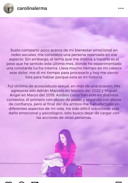 “Fui víctima de acoso/abuso sexual, en más de una ocasión. Mis agresores son Adrián Marcelo en febrero de 2022 y Miguel Ángel en marzo de 2019. Ambos casos han sido en distintos contextos, el primero con abuso de poder y el segundo con abuso de confianza, pero al final del día ambos me han afectado en diferentes aspectos de mi vida. Ha sido difícil sobrellevar este daño emocional y psicológico, solo busco dejar de cargar con las acciones de otras personas”, se lee.