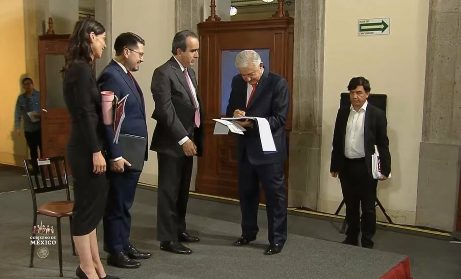 Al concluir su conferencia mañanera de este miércoles en Palacio Nacional, el presidente Andrés Manuel López Obrador firmó una copia de su tesis "Proceso de formación del Estado Nacional en México 1824-1867" y la regaló al youtuber Carlos Pozos "Lord Molécula".