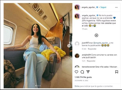 Ángela Aguilar es una de las celebridades juveniles más importantes del momento. No solo en la industria musical, sino por su influencia en la moda. Sin embargo, en la final del pasado Mundial de Qatar 2023 declaró ser "25% Argentina", hecho que hasta la fecha le sigue valiendo críticas.