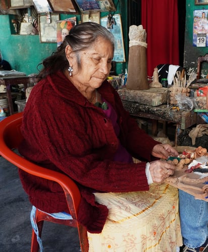 Guiada por la memoria de sus manos, que ahora miran por ella al deslizarse en el barro, la artesana va dando forma al rostro a cada uno de los personajes que integran el tradicional nacimiento de Navidad en México.