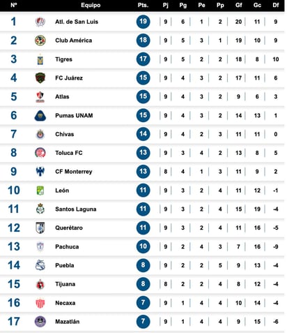 Así queda la tabla general tras la Jornada 9 del Apertura 2023