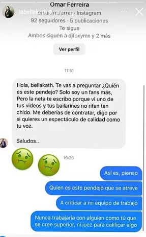 "Hola, Bellakath. Te vas a preguntar ¿quién es este pende**? Sólo soy un fan más, pero la neta te escribo porque vi uno de tus videos y tus bailarines no rifan tan chido. Me deberías de contratar, digo por si quieres un espectáculo de calidad como tu voz. Saludos", escribió el seguidor.