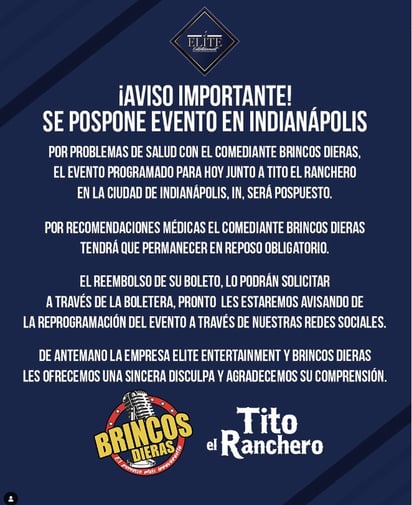A través de su cuenta de Instagram, Brincos Dieras compartió un comunicado de la empresa Elite Entertainment Group en donde se comunica que los shows fueron pospuestos, aunque no dieron a conocer mayores detalles sobre la situación que presenta.