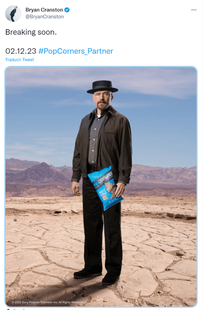 La marca y Cranston compartieron un adelanto de su trabajo, donde el actor aparece parado en el desierto mientras sostiene una gran bolsa de PopCorners con queso cheddar blanco.