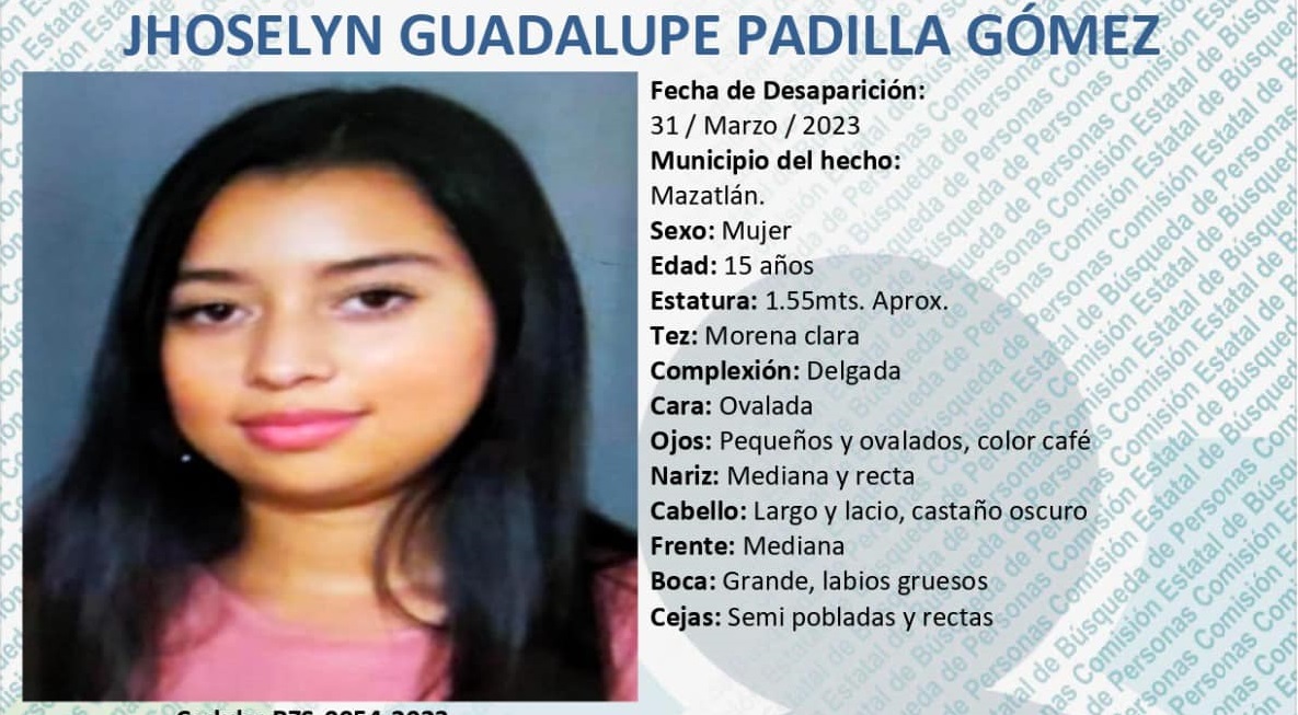 Otra joven de nombre Jhoselyn Guadalupe Padilla Gómez, de 15 años de edad, fue reportada como desaparecida en Mazatlán.