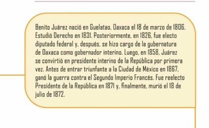 El libro Nuestros Saberes de tercer grado de primaria, contiene una línea del tiempo que marca el nacimiento del expresidente Benito Juárez el 18 de marzo, y no el 21 de ese mes.