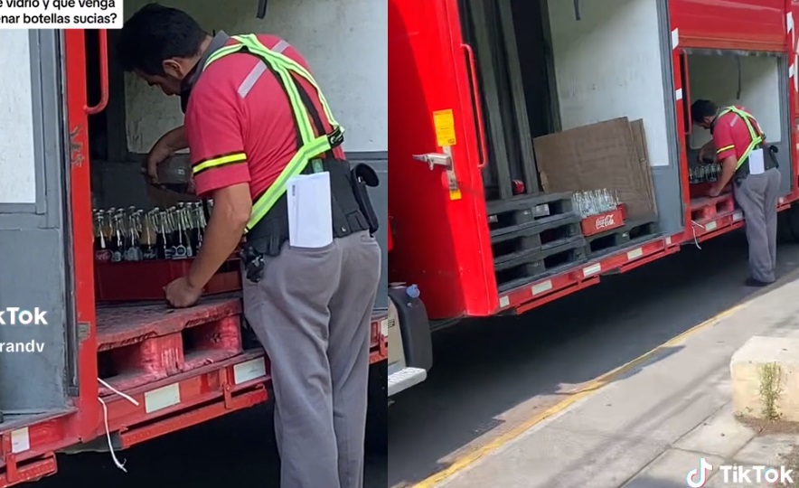 Las imágenes captadas por Fabiola Durán (@fabdurandv) muestran a un hombre que lleva el uniforme de la marca refresquera, mientras supuestamente rellena las botellas de vidrio en la parte trasera de un camión repartidor.