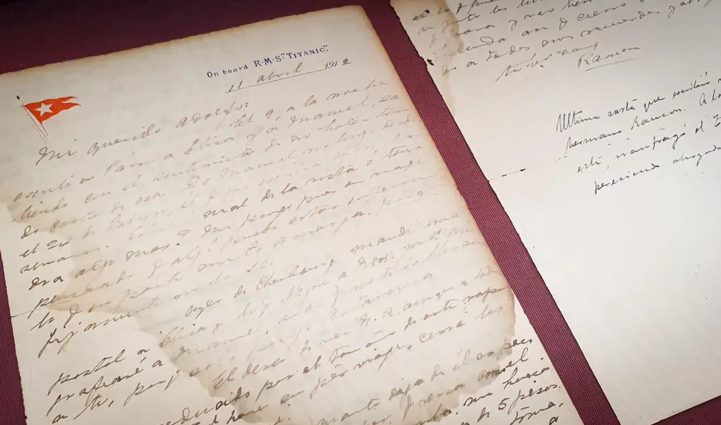 Escrita en papel con membrete y marca de agua de la compañía White Star Line, la misiva contiene dos folios con una mancha de humedad y una nota posteriormente escrita por su receptor que dice: "Última carta que escribió mi querido hermano Ramón. A los 3 días de esta, naufragó el Titanic, pereciendo ahogado".