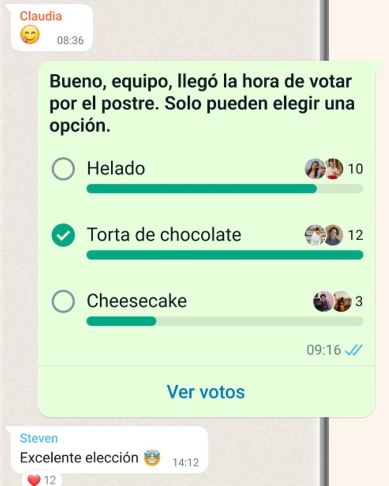 Una vez que tus contactos comiencen a responder la encuesta, verás los resultados y las estadísticas de las respuestas en la pantalla. Además, podrás ver qué respondió cada uno de los contactos si pulsas sobre la opción "Ver votos".