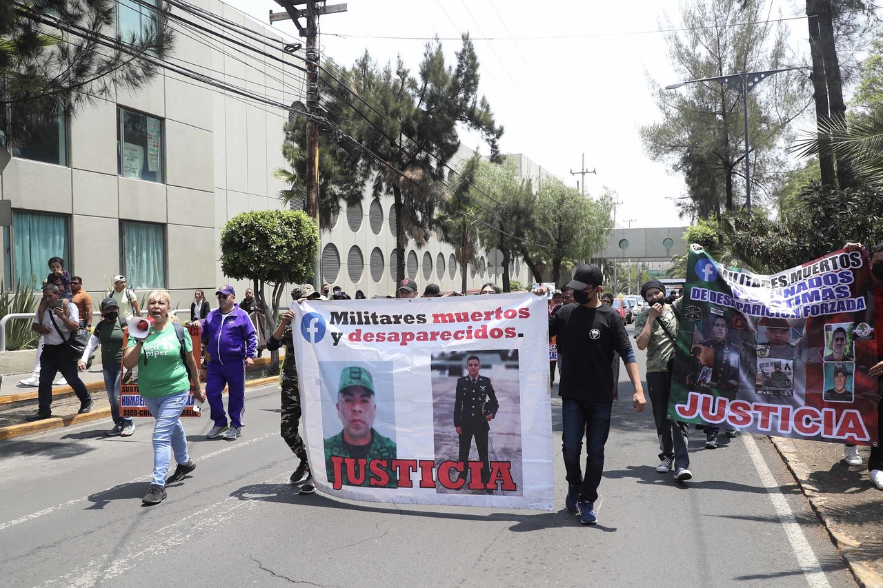 En la Ciudad de México, alrededor de 30 personas se concentraron en avenida Industria Militar, a un costado de la Secretaría de la Defensa Nacional (Sedena), donde colocaron pancartas sobre el césped con leyendas y nombres de elementos desaparecidos o asesinados.
