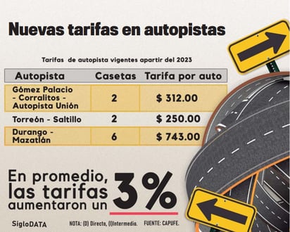 Respecto a la carretera Torreón-Saltillo, el uso de la autopista tendrá un costo de 250 pesos, ya que en la caseta de La Cuchilla se cobra $90, mientras que en la de Plan de Ayala se piden $159.