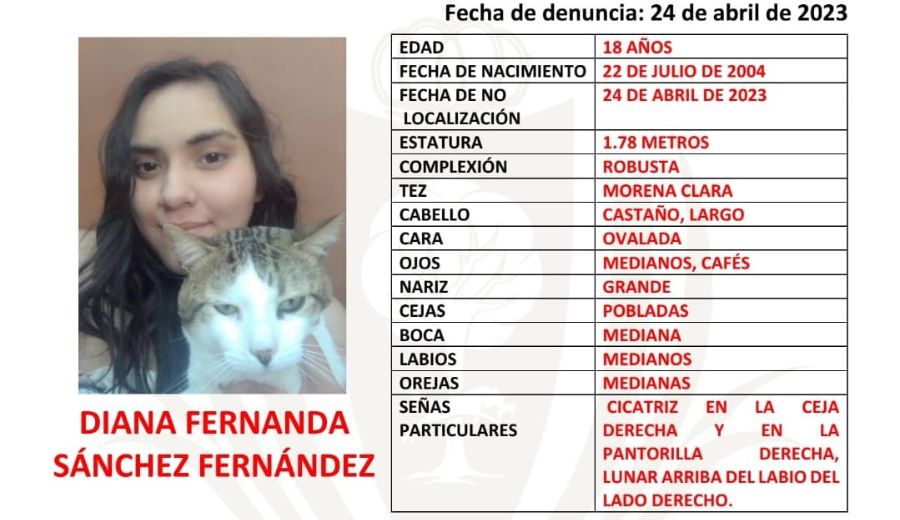 Diana Fernanda Sánchez Fernández, de 18 años de edad, desapareció el pasado lunes 24 de abril, día en que se denunció el hecho y se emitió su ficha de búsqueda.