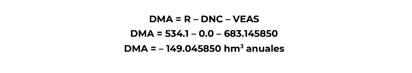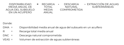 Conforme a la metodología indicada en la norma, se obtiene de restar al volumen de recarga total media anual, el valor de la descarga natural comprometida y el volumen de extracción de aguas subterráneas.