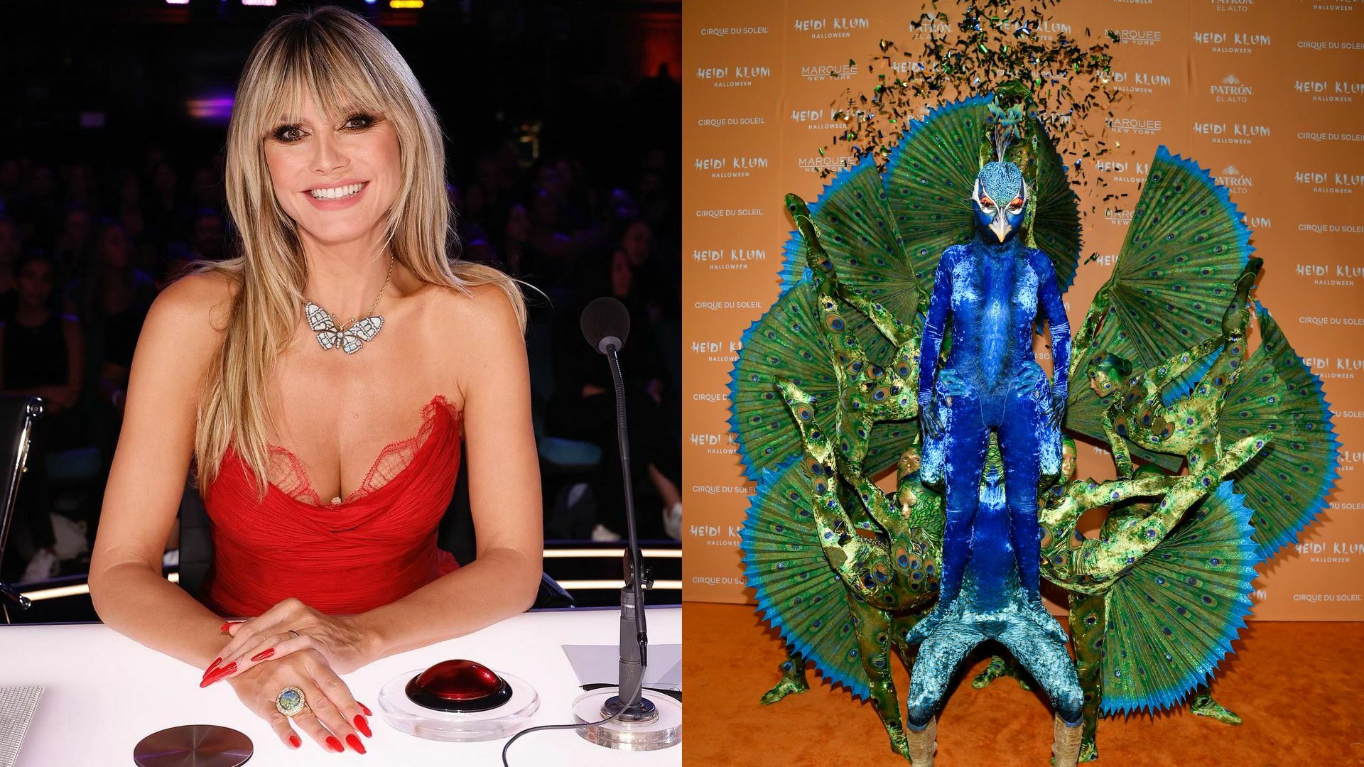 Heidi Klum agitó sus plumas el martes en un nuevo y elaborado disfraz de Halloween, vestida como un pavo real y con varios acróbatas que formaban su cola.