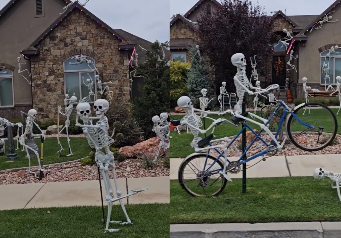 La joven transitaba por la calle cuando un conjunto de esqueletos gigantes atrajo su mirada. Por medio de un video mostró cada detalle de la decoración que causó furor entre los fans de Halloween.