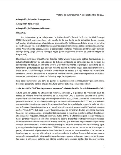 A través de una carta pública dirigida a los duranguenses, los medios de comunicación y al Gobierno del Estado, trabajadores y extrabajadores de la Coordinación Estatal de Protección Civil Durango (CEPC) denunciaron presuntos malos manejos de su titular, Arturo Galindo Cabada y de Jorge Gonzalo Paniagua Reyes, director de Gestión Integral de Riegos (GIR).