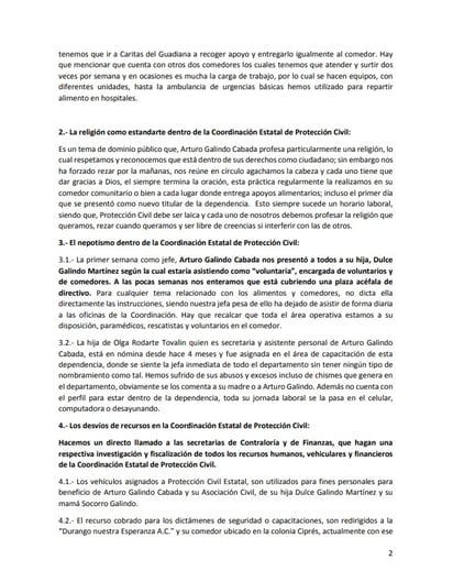 Al finalizar el escrito, de cuatro cuartillas, hacen un llamado a Contraloría y Secretaría de Finanzas para que se haga una investigación y fiscalización de todos los recursos humanos, vehiculares y financieros de la CEPC, pues las unidades oficiales son utilizadas para fines personales “en beneficio de Arturo Galindo Cabada, su Asociación Civil, de su hija y de su mamá”, aseguran.